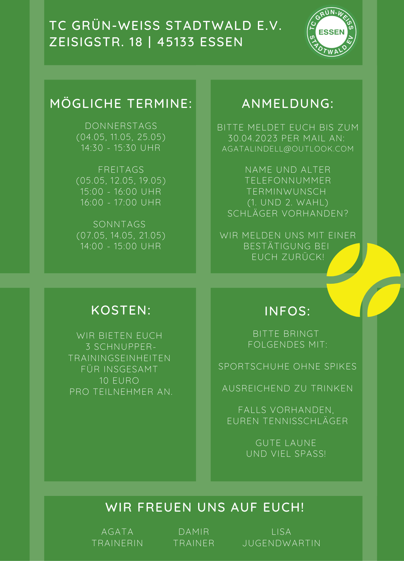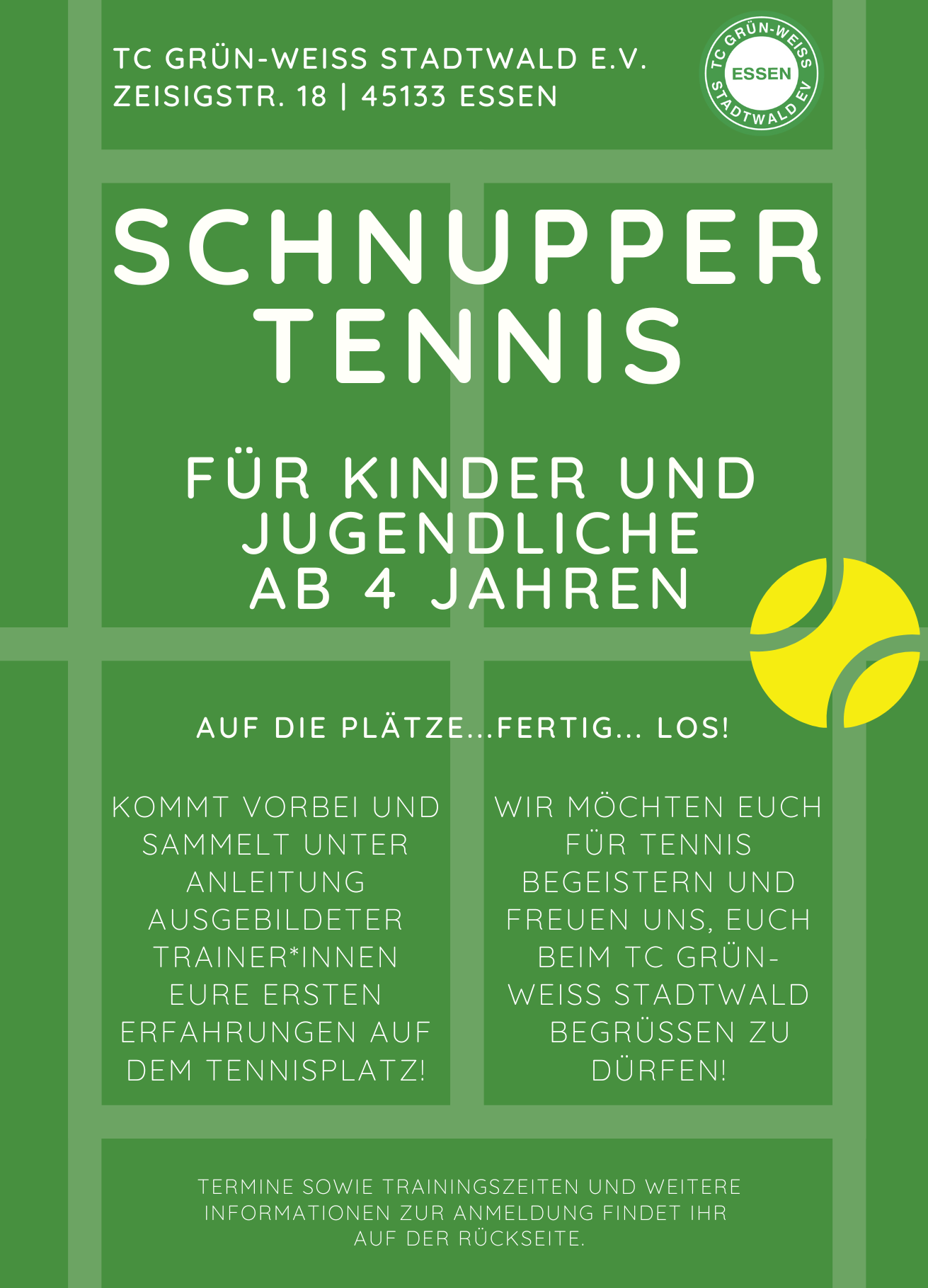 Kommt vorbei und sammelt eure ersten Erfahrungen auf dem Tennisplatz!
